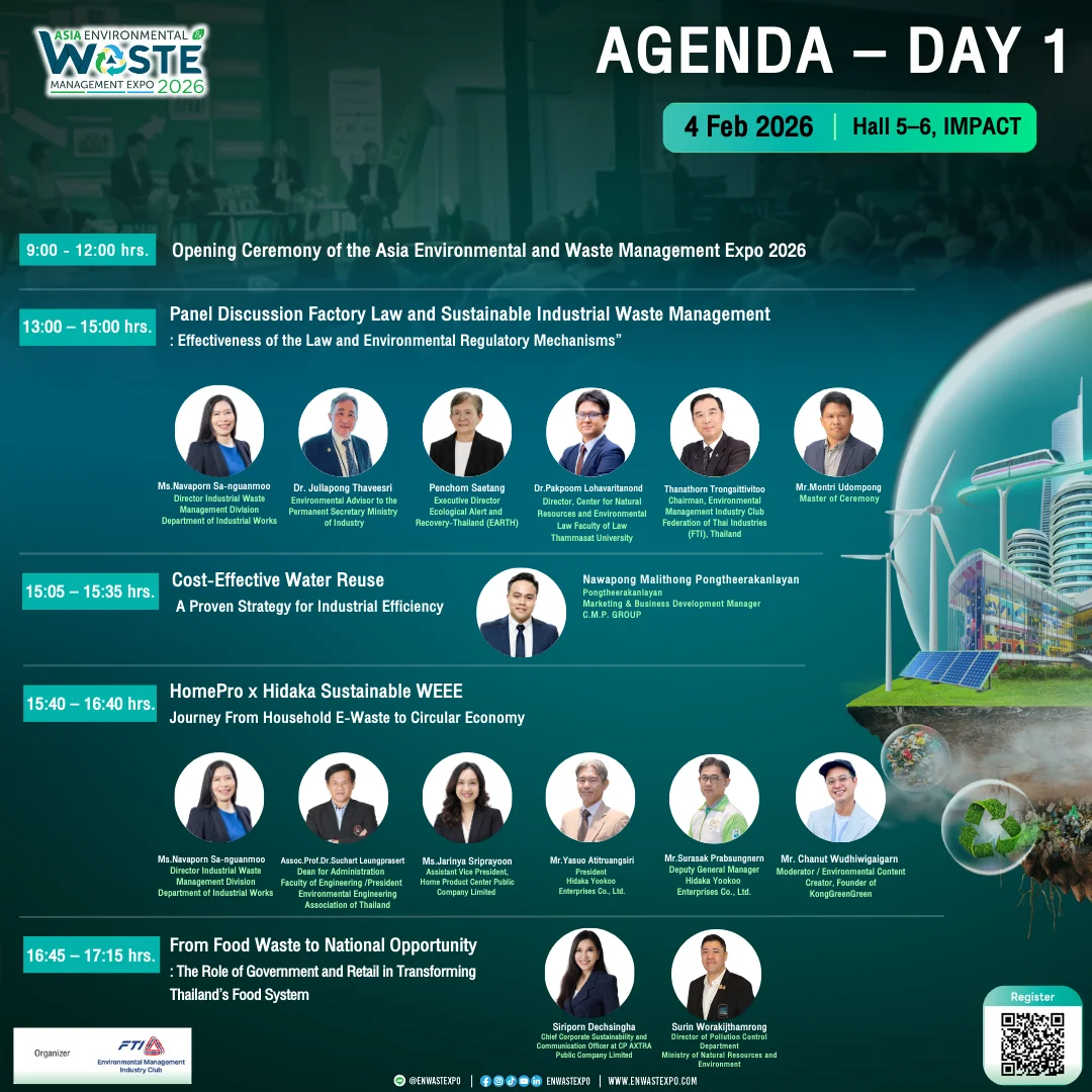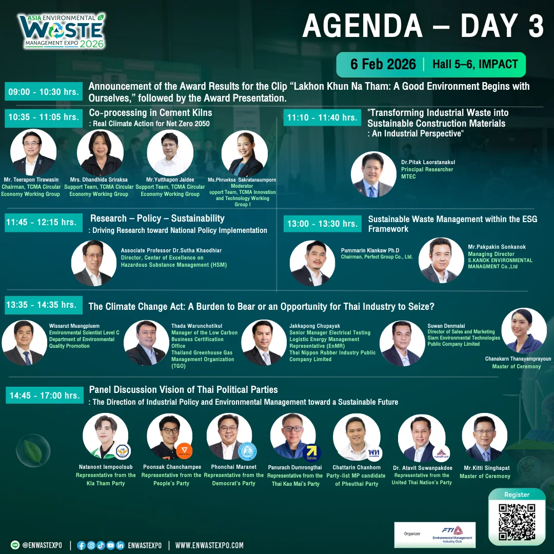 | 9:00 – 12:00 น. | Opening Ceremony : Asia Environmental and Waste Management Expo 2026 | ||