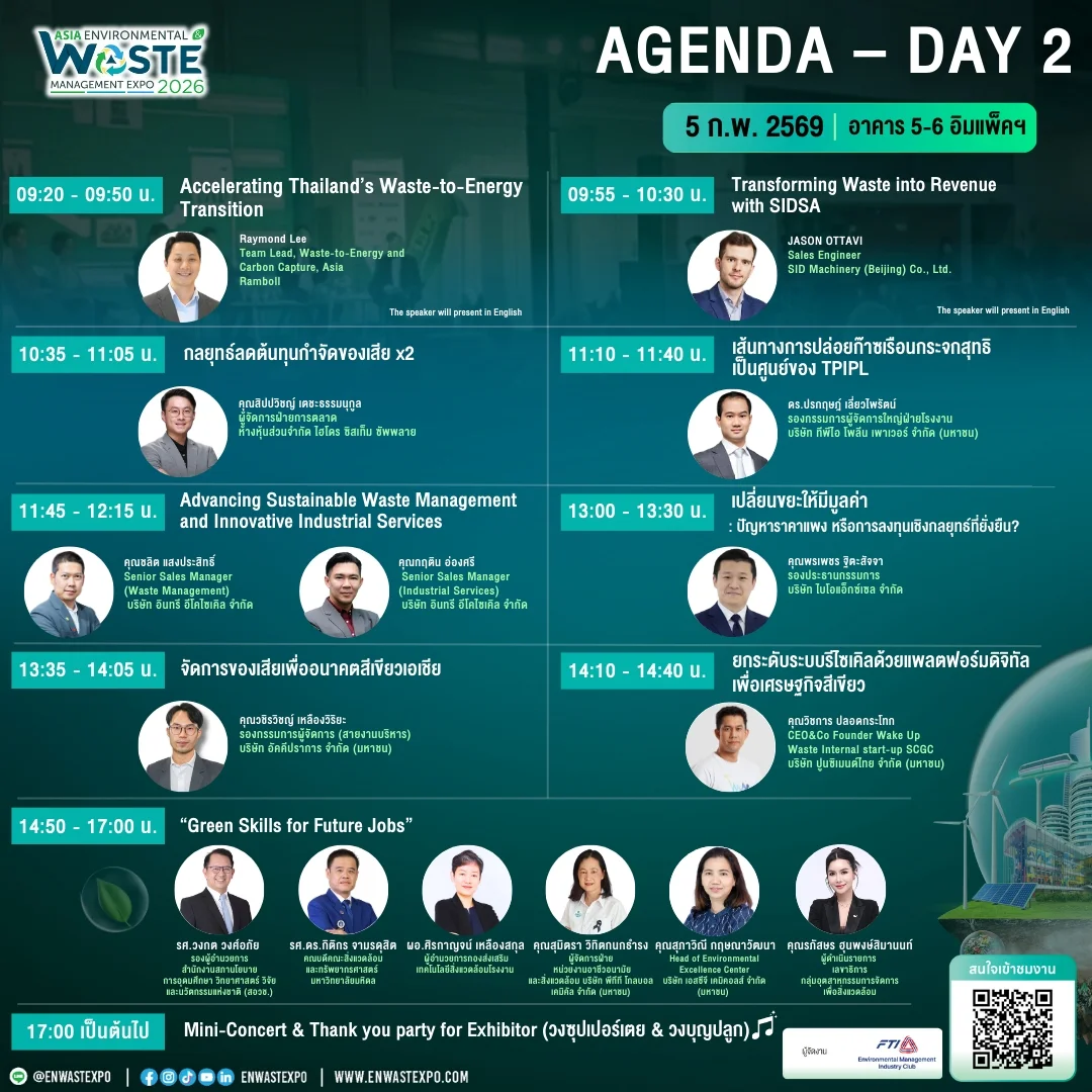 | 14:50 – 17:00 น. | “Green Skills for Future Jobs” • หลักสูตรสิ่งแวดล้อมในปัจจุบันตอบโจทย์ตลาดแรงงาน ? • เด็กสายไหนก็เข้ามาได้ ไม่จำเป็นต้องเรียนสิ่งแวดล้อม • อาชีพสิ่งแวดล้อมในปัจจุบันและอนาคต • ทักษะที่บริษัทต้องการจริง • ESG / Carbon / Sustainability ทำงานอะไรได้บ้าง ? | ผู้เข้าร่วมเสวนา: 1. รศ.วงกต วงศ์อภัย รองผู้อำนวยการ สำนักงานสภานโยบายการอุดมศึกษา วิทยาศาสตร์ วิจัยและนวัตกรรมแห่งชาติ (สอวช.) 2. รองศาสตราจารย์ ดร.กิติกร จามรดุสิต คณบดีคณะสิ่งแวดล้อมและทรัพยากรศาสตร์ มหาวิทยาลัยมหิดล 3. ผอ.ศิรกาญจน์ เหลืองสกุล ผู้อำนวยการกองส่งเสริมเทคโนโลยีสิ่งแวดล้อมโรงงาน 4. คุณสุมิตรา วิทิตกนกธำรง ผู้จัดการฝ่าย หน่วยงานอาชีวอนามัยและสิ่งแวดล้อม บริษัท พีทีที โกลบอล เคมิคัล จำกัด(มหาชน) 5. คุณสุภาวิณี กฤษณาวัฒนา หัวหน้าศูนย์ความเป็นเลิศด้านสิ่งแวดล้อม บริษัท เอสซีจี เคมิคอลส์ จำกัด(มหาชน) | คุณรภัสษร ฮุนพงษ์สิมานนท์ เลขาธิการ กลุ่มอุตสาหกรรมการจัดการเพื่อสิ่งแวดล้อม |