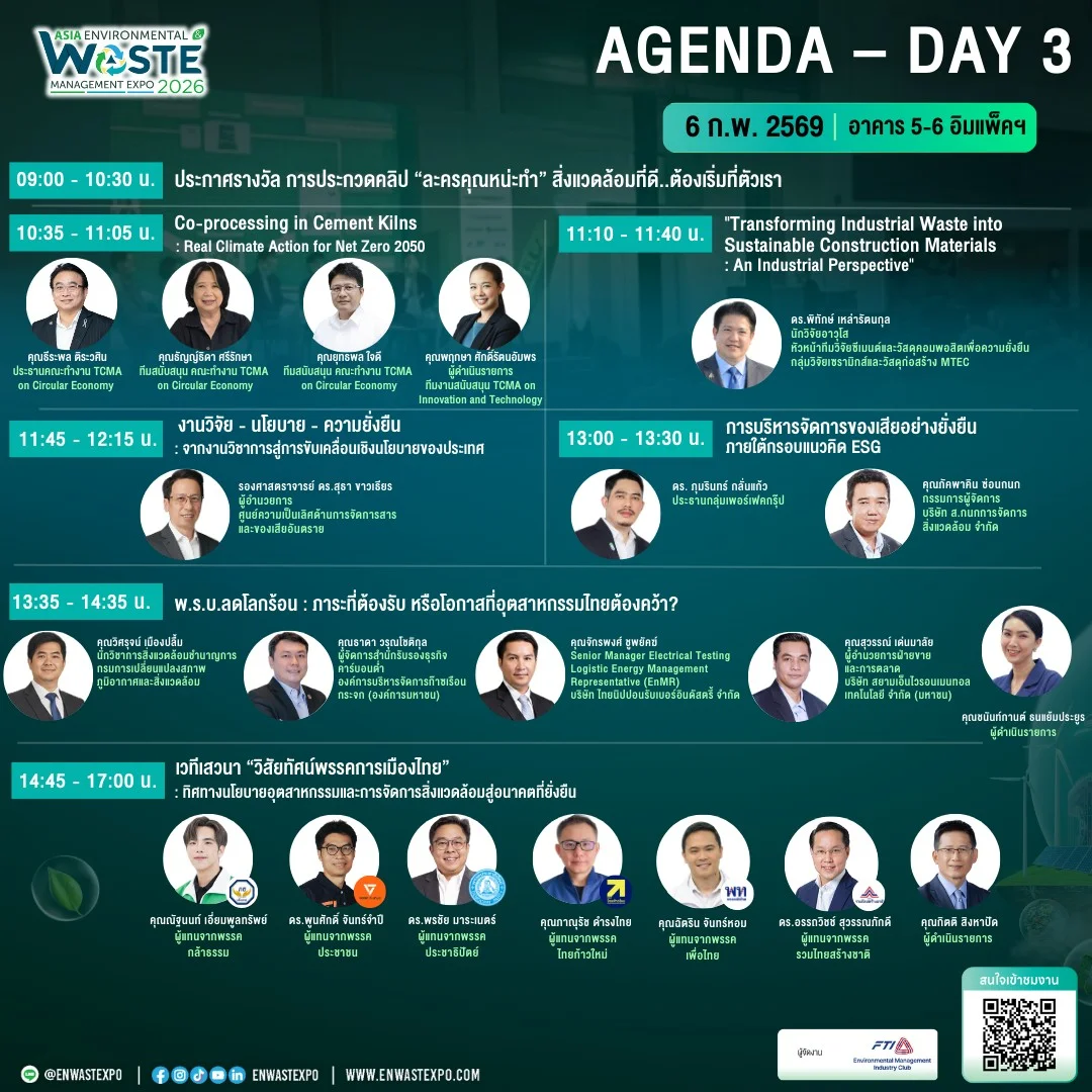 | 14:45 – 17:00 น. | เวทีเสวนา “วิสัยทัศน์พรรคการเมืองไทย : ทิศทางนโยบายอุตสาหกรรมและการจัดการสิ่งแวดล้อมสู่อนาคตที่ยั่งยืน” • นโยบายอุตสาหกรรมของพรรคต่อการเติบโตทางเศรษฐกิจ • มุมมองต่อ Green Industry / Circular Economy • การกำกับดูแลสิ่งแวดล้อมกับขีดความสามารถการแข่งขัน • บทบาทรัฐ เอกชน และประชาชน ในการพัฒนาอย่างยั่งยืน” | ผู้เสวนาบนเวที: 1. คุณณัฐนนท์ เอี่ยมพูลทรัพย์ ผู้แทนจากพรรคกล้าธรรม 2. ดร.พูนศักดิ์ จันทร์จำปี ผู้แทนจากพรรคประชาชน 3. ดร.พรชัย มาระเนตร์ ผู้แทนจากพรรคประชาธิปัตย์ 4. คุณภาณุรัช ดำรงไทย ผู้แทนจากพรรคไทยก้าวใหม่ 5. คุณฉัตริน จันทร์หอม ผู้แทนจากพรรคเพื่อไทย 6. ดร.อรรถวิชช์ สุวรรณภักดี ผู้แทนจากพรรครวมไทยสร้างชาติ | คุณกิตติ สิงหาปัด ผู้สื่อข่าวจากรายการข่าว 3 มิติ |